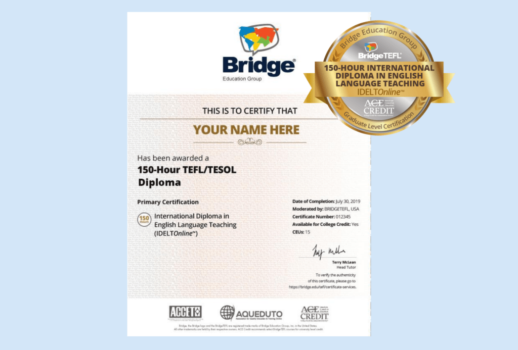 Your Bridge TEFL certification is what actually qualifies you to teach English as a foreign language or to work in a specialized field, such as teaching young learners or teaching business English. Your Bridge certificate indicates the name of the program you took, the total number of hours you completed, and a list of the course components.