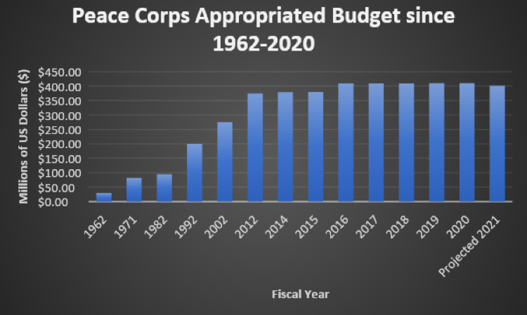 Under the Office of Foreign Affairs, the Peace Corps received $410.5 million from the US Treasury in 2020. The 2020 appropriated budget from the US Treasury was an 8% increase from the 2015 appropriated budget of $379.5 million.