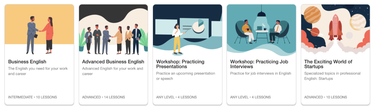 Certain language learning apps, such as Cambly, serve as platforms that give students the opportunity to practice conversational English or attend courses. Cambly offers special courses focused on business English and professional development in areas like interviewing, giving presentations and running a startup.